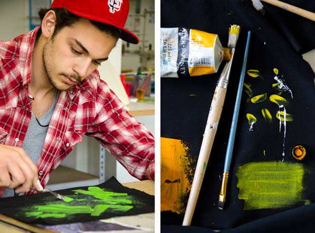 „Frisch gestrichen“ ist eine Kollektion, die körperferne, drapierte Schnitte mit Acryl-Farbspuren auf Stoff kombiniert. Die Acrylfarbe wurde von den Modedesignern – frisch gestrichen – direkt mit der Hand oder der Farbrolle auf die zugeschnittenen Stoffteile aufgetragen. Der Farbauftrag macht jedes Kleidungsstück zu einem Unikat und die gesamte Kollektion einzigartig.