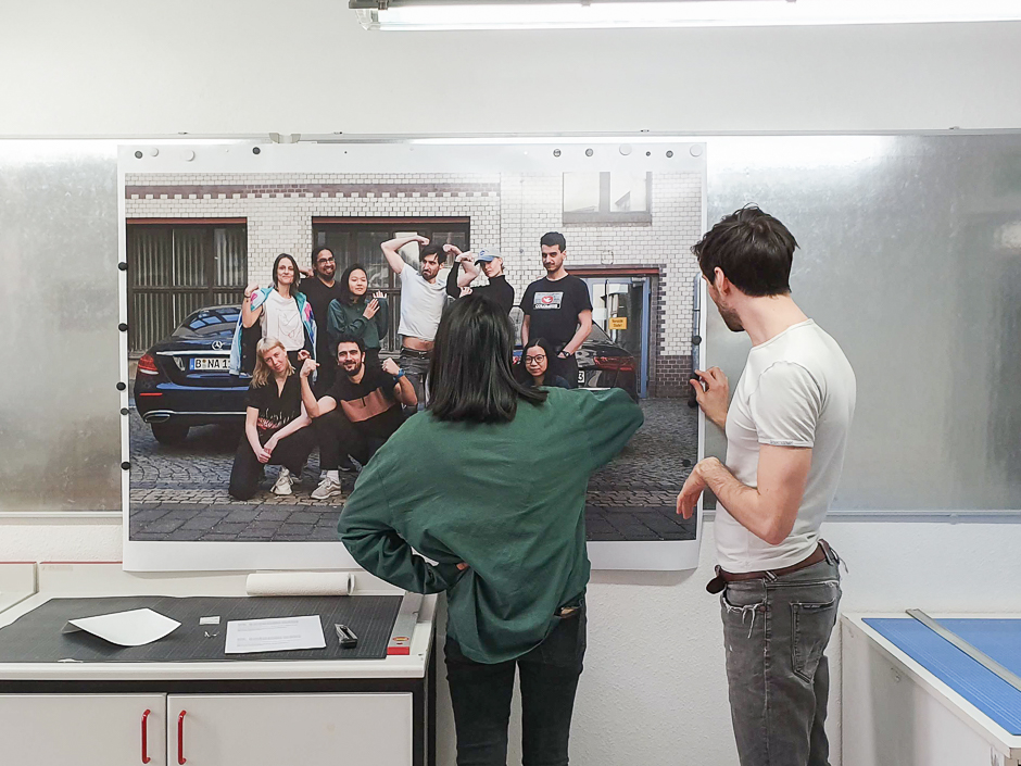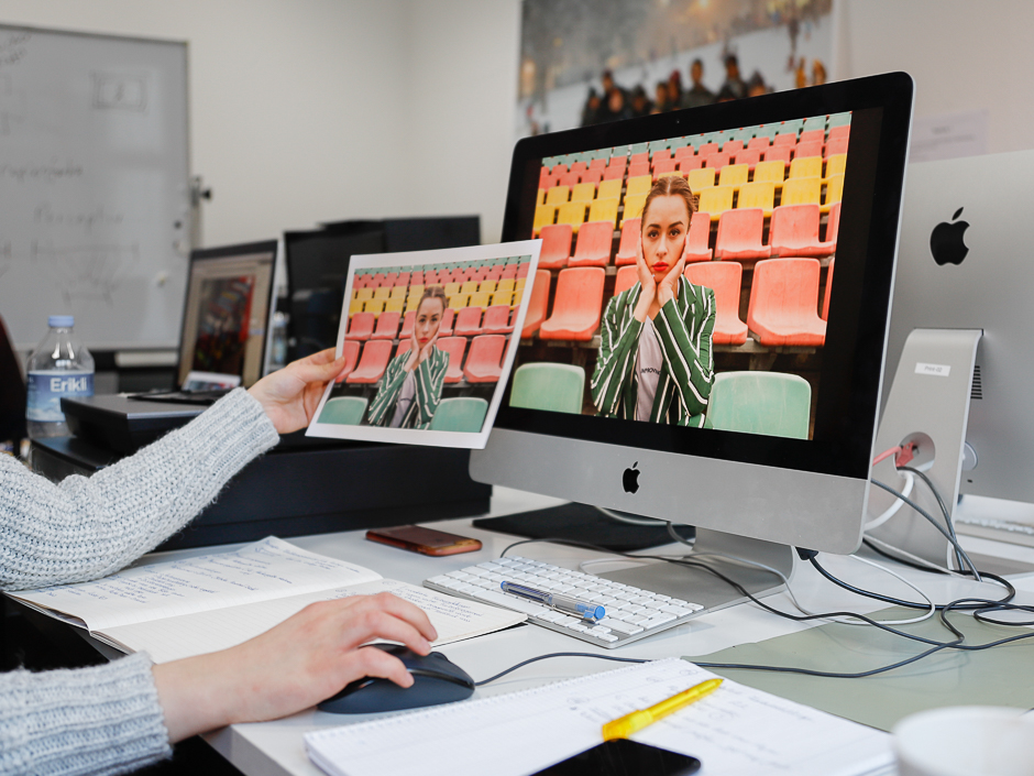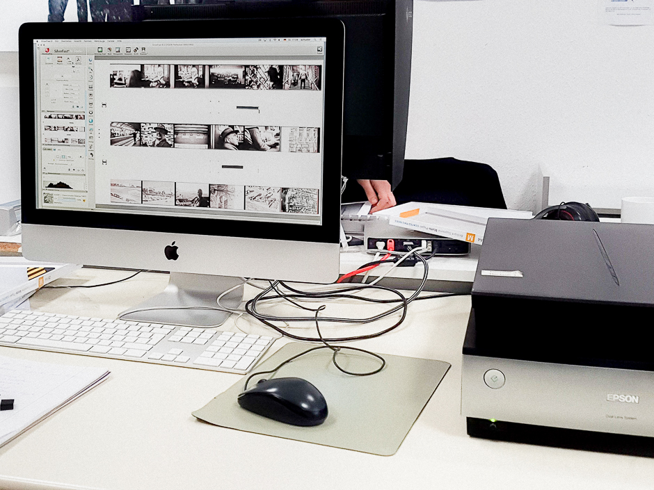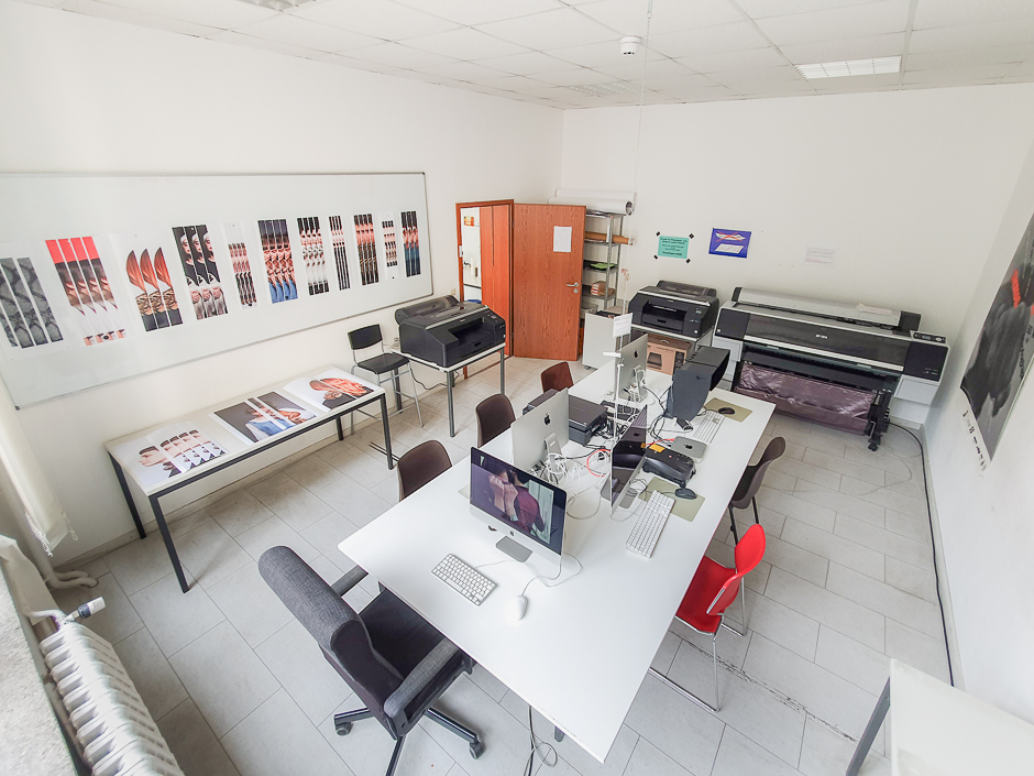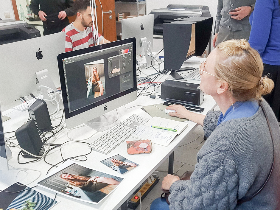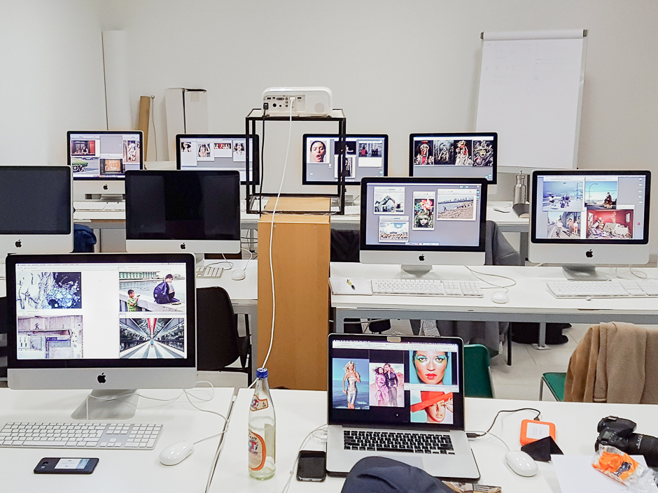 The Computer Room of the Neue Schule für Fotografie is equipped with colour calibrated apple computers with Photoshop, Lightroom, and Indesign for students to work with photographs and layouts.