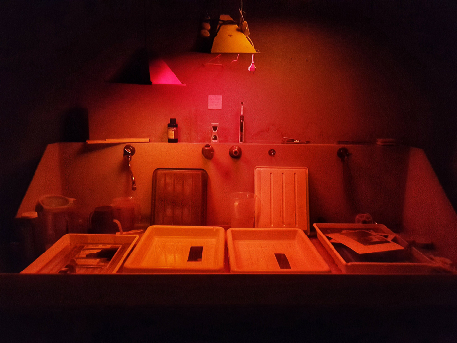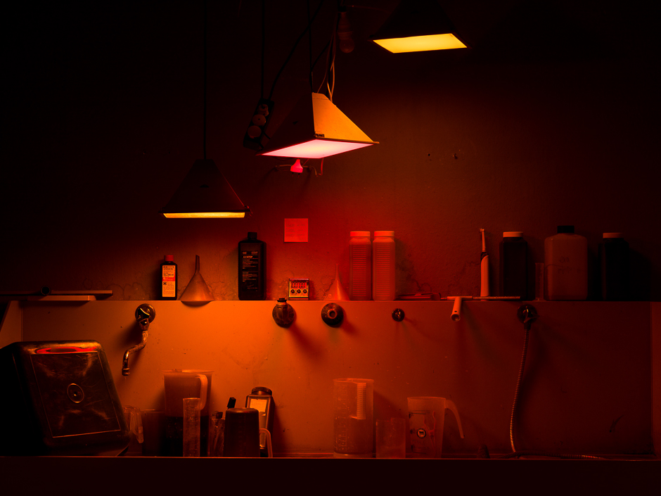 In der Neuen Schule für Fotografie stehen den Studierenden zwei gut ausgestattete Schwarzweißlabore zur Verfügung. An zehn unterschiedlichen Arbeitsplätzen können sie die professionellen Vergrößerungsapparate nutzen, um sämtliche Formate von Kleinbild-, Mittelformat- und Großbildfilmen zu verarbeiten.